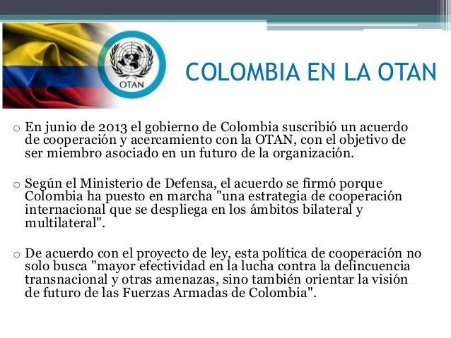 En octubre de 2015, buques de la Armada de Colombia participaron junto a otras fragatas de la OTAN, en las Fuerzas de tarea internacionales 465 y 508. Entre las últimas actividades conjuntas realizadas, están las visitas de altos oficiales del Cuartel general de la OTAN en Bruselas, Bélgica, quienes hasta el 4 de agosto, supervisaron la confección del citado nuevo plan estratégico del Ejército del régimen colombiano.