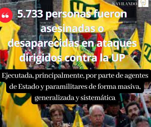 A través del Auto 75 del 2022, la Sala de Reconocimiento de Verdad y de Responsabilidad de la JEP determinó que 5.733 personas fueron asesinadas o desaparecidas en ataques dirigidos contra el partido político Unión Patriótica (UP) entre 1984 y 2016, en hechos en los que están vinculados principalmente paramilitares y agentes estatales, quienes actuaron de manera masiva, generalizada, sistemática y selectiva contra esta colectividad.