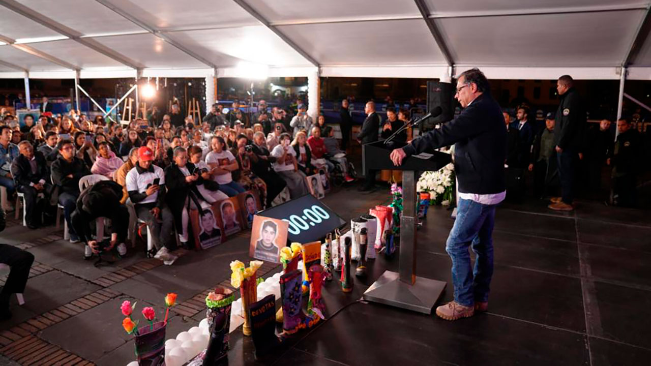 El presidente Gustavo Petro reconoció con estas palabras la responsabilidad del Estado colombiano en los asesinatos de 19 jóvenes residentes en el municipio cundinamarqués de Soacha y en Bogotá, cometidos por miembros del Ejército Nacional entre los años 2004 y 2008