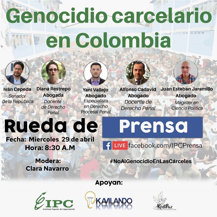 Dado el riesgo claro y real que representa la pandemia del COVID-para las personas privadas de la libertad en los centros carcelarios además de las personas que trabajan en ellos y ante la negligencia del gobierno Duque, te invitamos para que nos acompañes mañana miércoles 29 de abril en la rueda de prensa a las ? 8:30 am a traves de Facebook.com/IPCPrensa y con el Hashtag #NoAlGenocidioEnLasCárceles