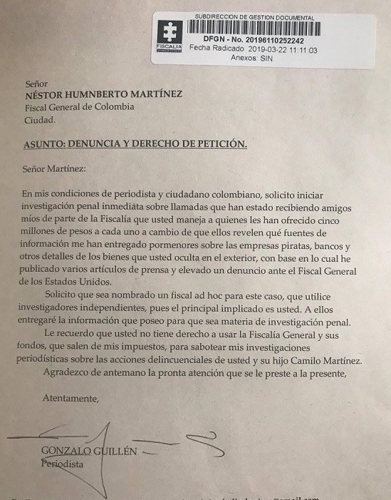 Así lo dencuncia Gonzalo Guillen en un derecho de petición entregado a dicha entidad el pasado 22 de marzo. La Fiscalía ahora ¿actúa de policía política del Gobierno de turno?