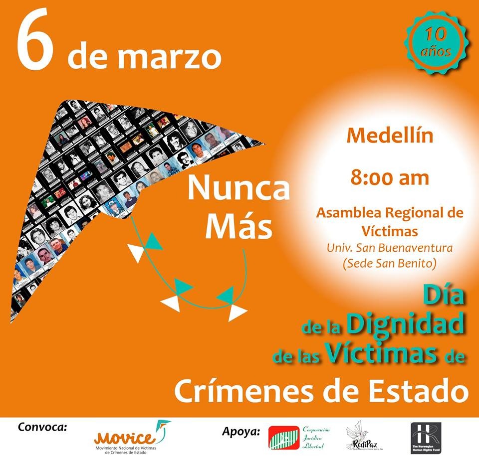 Este 6 de marzo en el marco del día de la dignidad de las víctimas de crímenes de Estado se realizará la Asamblea Regional-Antioquia, en el Auditorio de la Universidad de San Buenaventura, Medellín, de 8 am a 5 pm, en simultánea se realizarán actividades en todo el país.
