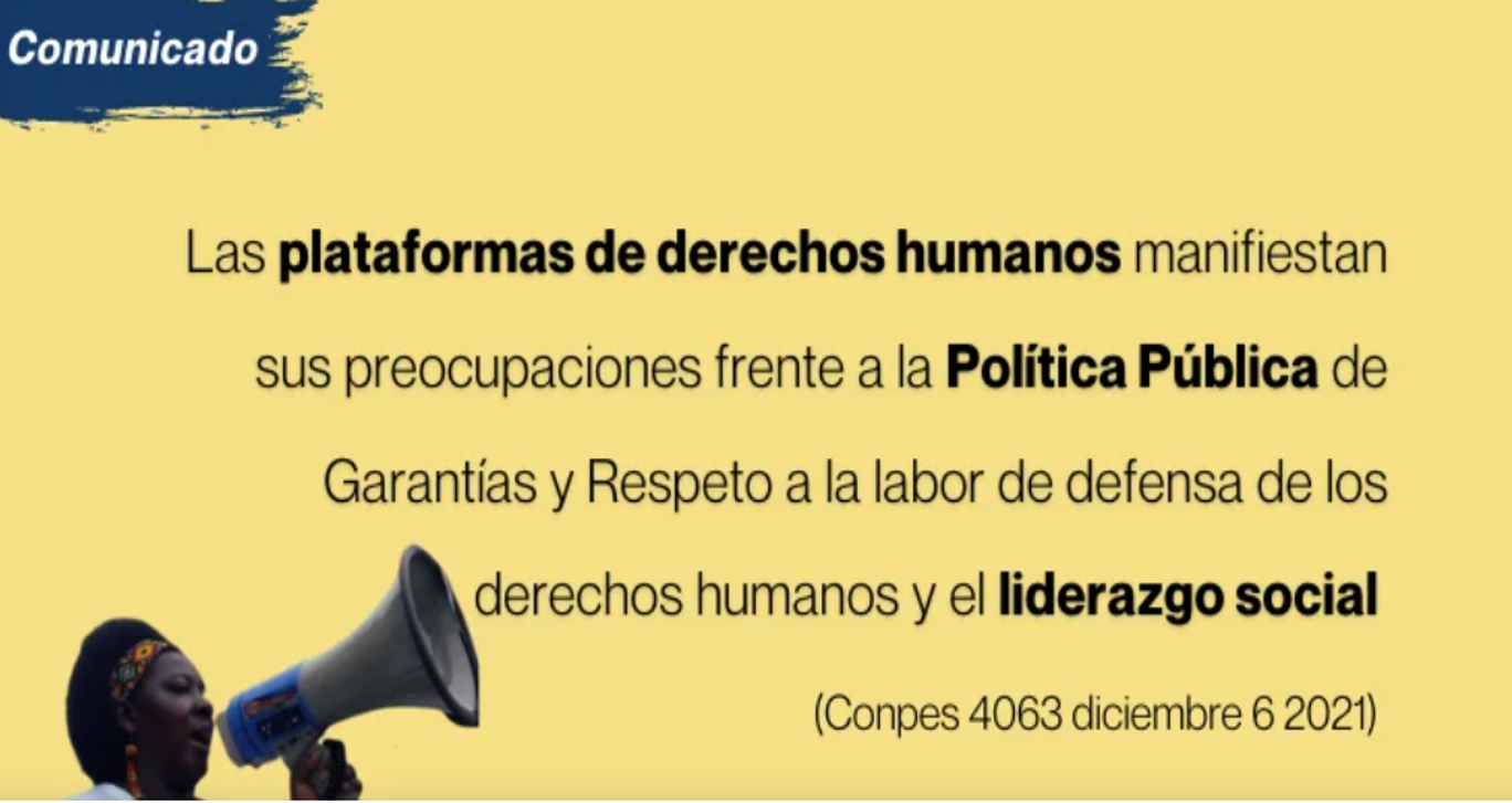 Las plataformas de derechos humanos manifiestan sus preocupaciones frente a la Política Pública de Garantías y Respeto a la labor de defensa de los derechos humanos y el liderazgo social (Conpes 4063 diciembre 6 2021)