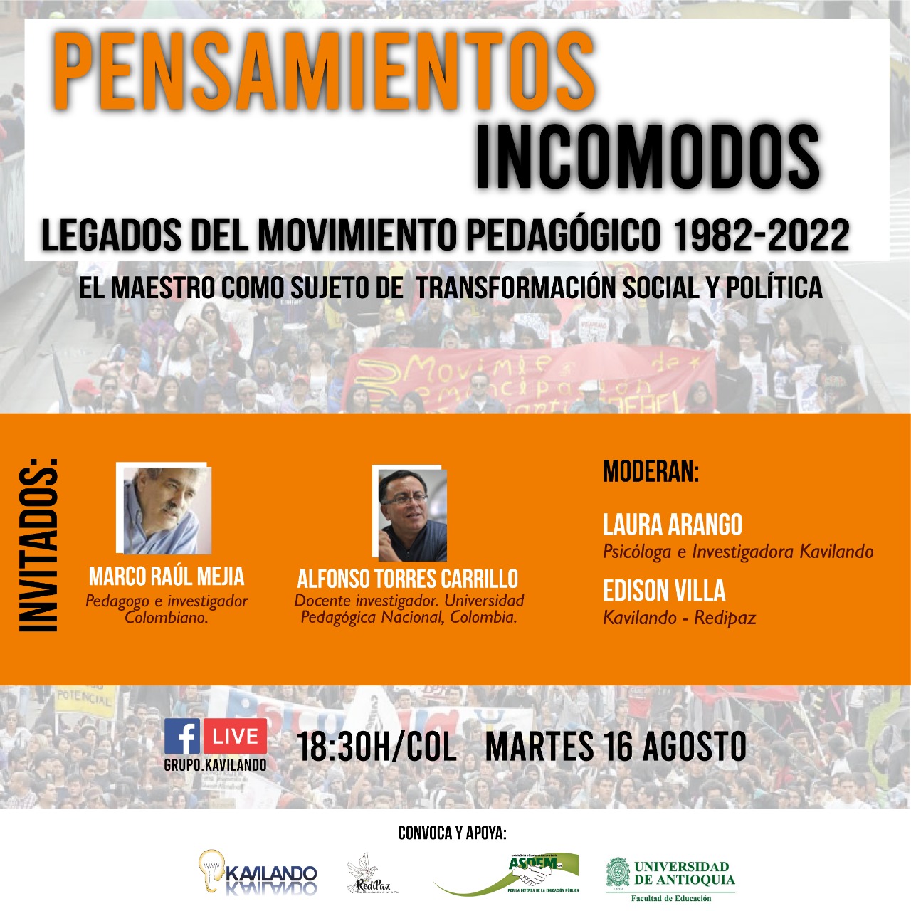 Martes 16 de agosto, 18.30HCol Personas Invitadas: Marco Raúl Mejía Pedagogo e investigador, Alfonso Torres Carrillo Docente Invesitgador Universidad Pedagógica Nacional. Moderan: Laura Arango Investigadora Kavilando, Edison Villa Kavilando - Redipaz. Ciclo Pensamientos Incómodos. En Vivo por: https://web.facebook.com/grupo.kavilando