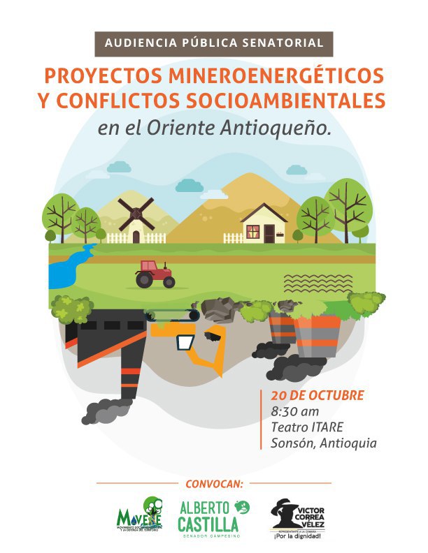 El próximo 20 de octubre en el Teatro ITARE del municipio de Sonsón (Antioquia), desde las 8 y 30 am, se realizará la audiencia pública del Senado de la República: “Proyectos minero energéticos y conflictos socio-ambientales en el oriente antioqueño”