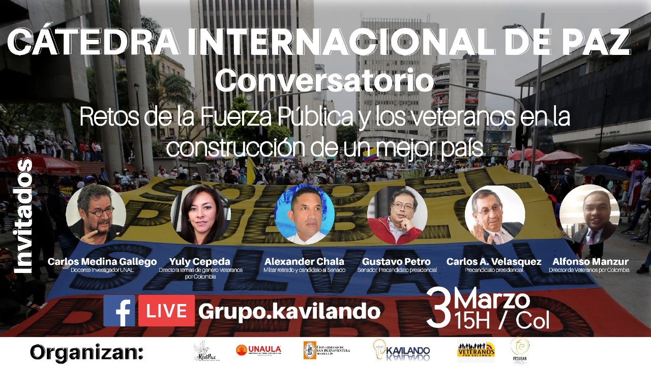 Jueves 3 de marzo 15H Colombia. Personas invitadas: Gustavo Petro Senador Precandidato Presidencial, Carlos Velazquez candidato Presidencial, Alexander Chala Veteranos por Colombia candidato al Senado, Carlos Medina Gallego Docente Invetigador UNAL, Yuly Cepeda Directora Veteranos por Colombia, Alfonso Manzur Veteranos por Colombia. En Vivo por: https://www.facebook.com/grupo.kavilando