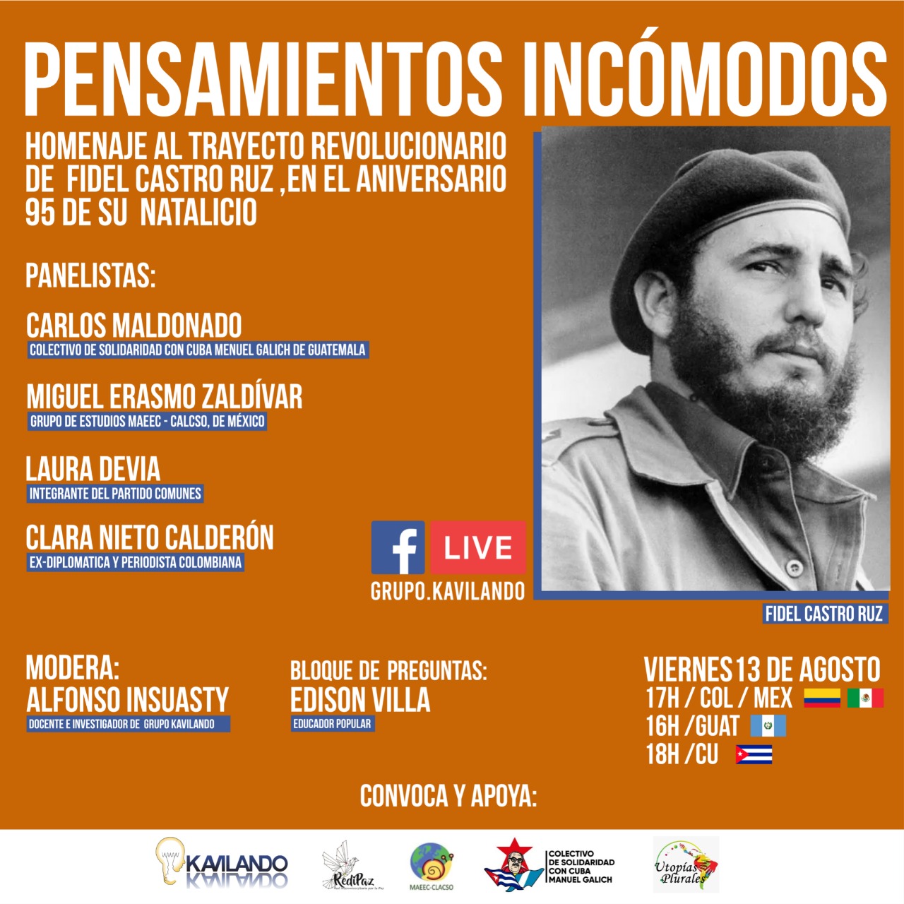Viernes 13 de agosto 17HCol. 16H Guatemala, 18HCuba. Personas Invitadas: Carlos Maldonado Colectivo Manuel Galich (Guatemala) Miguel Erasmo Zaldívar Colectivo Maeec (Mexico) Laura Devia, Partido Comunes (Colombia) Claro Nieto Calderon Exdiplomática y Periodista. (Colombia). Modera Alfonso Insuasty Universidad de San Buenaventura Medellín Preguntas Edison Villa Grupo Kavilando. En vivo por: https://www.facebook.com/grupo.kavilando