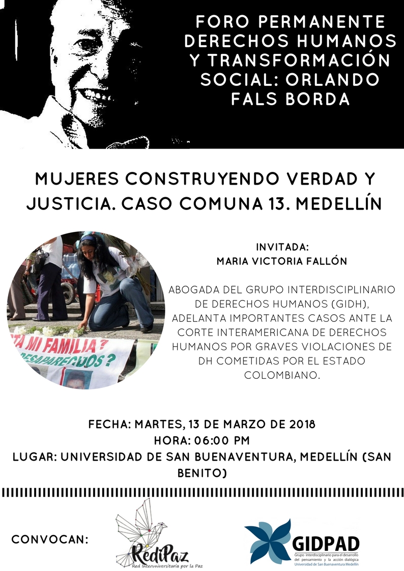 Maria Victoria Fallon abogada del GIDH abrirá el Ciclo de conferencias en el marco de Foro permanente de derechos humanos y transformacion social Orlando Fals Borda, del primer semestre de 2018, un escenario para debatir problemáticas sociales.