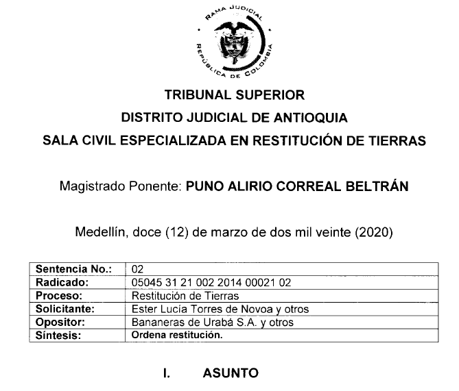 La primera sentencia fue proferida por la Sala de Restitución de Tierras del Tribunal Superior de Antioquia. Este compulsó copias a la Fiscalía para investigar penalmente a los propietarios de las empresas bananeras Uniban, Banacol, Bananeras de Urabá S.A. y a los empresarios Rosalba Zapata y Felipe Arcesio Echeverry Zapata por el presunto delito de concierto para delinquir en la financiación voluntaria de grupos paramilitares. Los hechos indican que se gestó toda una trama del despojo, en la que resultaron beneficiadas estas importantes empresas exportadoras de banano en Colombia.
