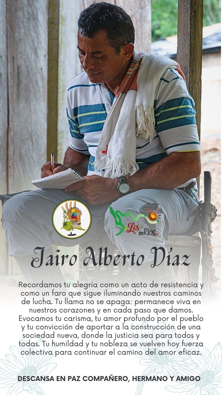 de la Junta de Acción Comunal. Al momento de su asesinato, se desempeñaba como tesorero de la JAC de la vereda El Jardín y de la Asociación. Líder histórico y ampliamente reconocido por su trayectoria en la región, era padre de cinco hijos, habitante de la vereda desde hacía más de 20 años, cultivador de alimentos de pan coger y una persona comprometida con la siembra de vida y dignidad en su territorio.
