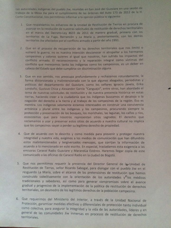 Los Jiw ya sienten preocupación por esta situación, tanto que en el comunicado rechazan “la forma distorsionada y malintencionada con la que algunos abogados, periodistas y políticos del departamento del Guaviare han abordado el tema de nuestras solicitudes de restitución”, y hacen un llamado a Sabogal para que viaje hasta el resguardo La María “para dialogar sobre el alcance de las pretensiones de restitución que hemos construido colectivamente”. También solicitan a la Unidad de Protección medidas que garanticen la vida y seguridad de las comunidades en procesos de restitución.