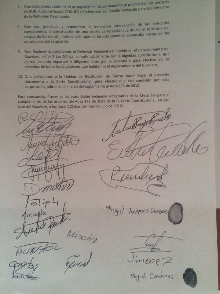 A partir de talleres realizados con los indígenas Jiw y Tukano y con las familias no indígenas, la DAE solicitó en la demanda la ampliación, formalización del resguardo, y su saneamiento: compra de propiedades y mejoras a las 85 familias que lo habitan y su reubicación en condiciones dignas y estables. Como lo resalta la Universidad Nacional, esas familias por habitar en un territorio étnico están “excluidas de programas de inversión o desarrollo por parte del Estado o de la posibilidad de acceder a créditos bancarios”. (Lea la carta enviada por la Universidad Nacional).