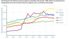 La cuota de riqueza de los más ricos en cada país no ha parado de aumentar desde 1980. Cada vez acumulan más parte de la tarta de los ingresos.