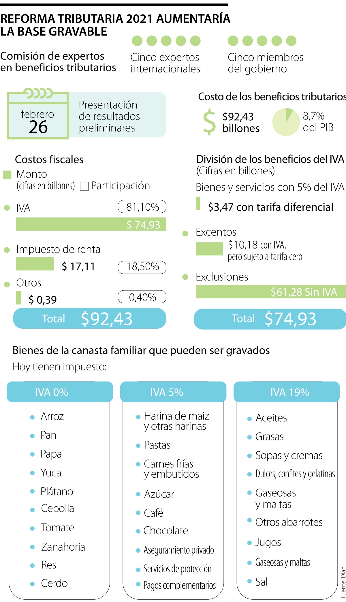 El Gobierno presentará la reforma tributaria ante el Congreso en el primer semestre de 2021 y aunque la Comisión de Expertos en Beneficios Tributarios aún está preparando un informe preliminar de recomendaciones, el viceministro de Hacienda Juan Alberto Londoño anunció que se ampliaría la base gravable del IVA. “Hay ciertos bienes que podemos gravar, no gravar toda la canasta familiar, eso no pasará, pero sí podemos ampliar la base de productos que paguen IVA”, dijo el funcionario.