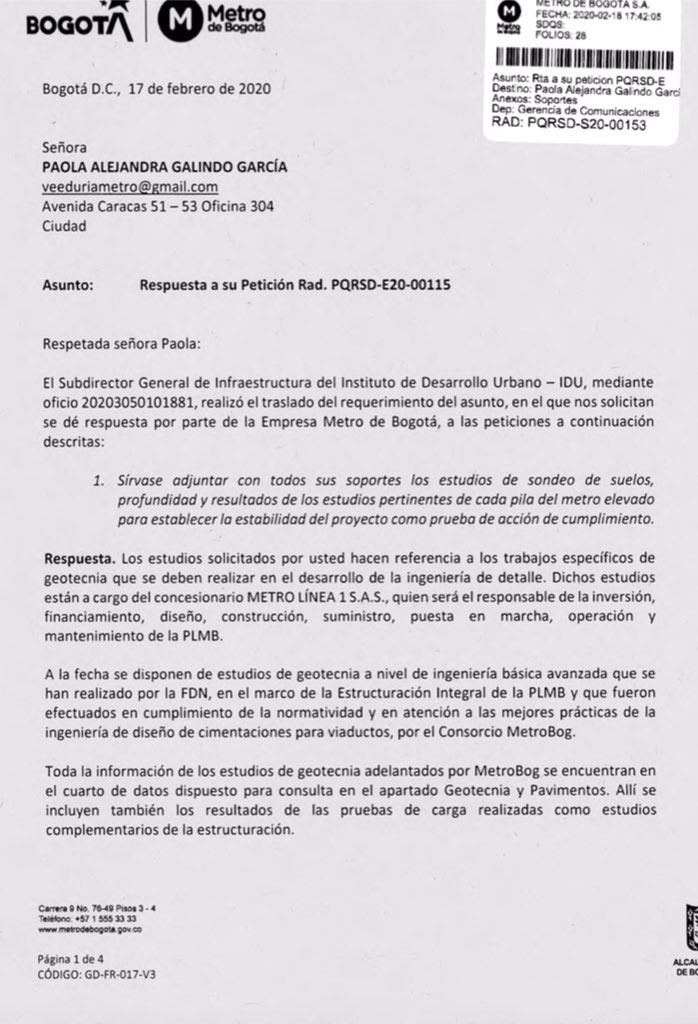 El ente de control presentó a finales de 2019 un informe en el que concluye que "los estudios del subterráneo llegaron a un nivel de ingeniería básica avanzada (ingeniería de detalle), mientras que los del elevado solamente alcanzaron el nivel de factibilidad".