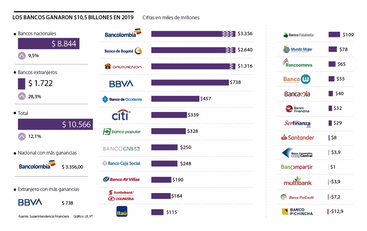 De los $10,56 billones que los 25 bancos que operan en Colombia ganaron durante 2019, las tres compañías obtuvieron $7,3 billones