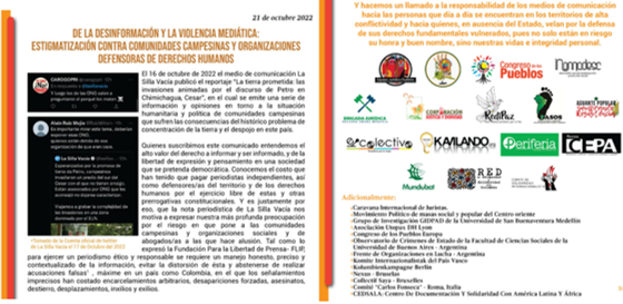 Conocemos el costo que han tenido que pagar periodistas independientes, así como defensores/as del territorio y de los derechos humanos por el ejercicio libre de estas y otras prerrogativas constitucionales. Y es justamente por eso, que la nota periodística de La Silla Vacía nos motiva a expresar nuestra más profunda preocupación por el riesgo en que pone a las comunidades campesinas y organizaciones sociales y de abogados/as a las que hace alusión. Tal como lo expresó la Fundación Para la Libertad de Prensa- FLIP, para ejercer un periodismo ético y responsable se requiere un manejo honesto, preciso y contextualizado de la información, evitar la distorsión de ésta y abstenerse de realizar acusaciones falsas, máxime en un país como Colombia, en el que los señalamientos imprecisos han costado encarcelamientos arbitrarios, desapariciones forzadas, asesinatos, destierro, desplazamientos, inxilios y exilios.