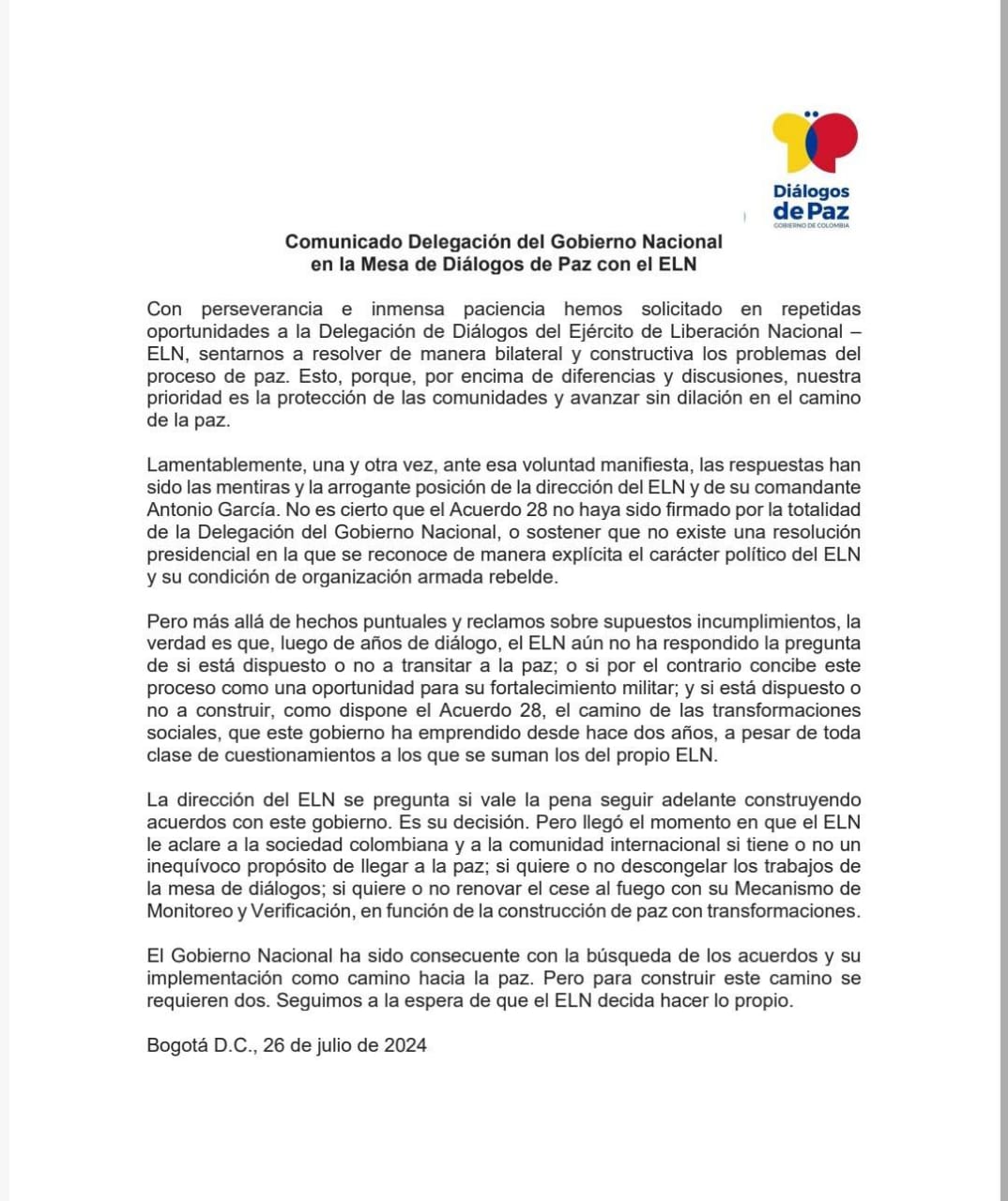 La lucha por alcanzar una paz duradera en Colombia enfrenta nuevos obstáculos, el Ejército de Liberación Nacional (ELN) y el Gobierno Nacional intercambian acusaciones de incumplimientos y falta de voluntad.