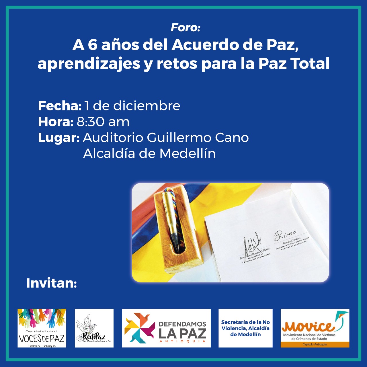 El primero de diciembre, de 8:30 am a 12.30 pm, en el auditorio Guillermo Cano, Centro Administrativo Alcaldía de Medellín se realizará un Foro para conversar sobre la implementación del acuerdos de Paz, falencias y retos de cara a una #PazTotal. Favor inscribirse si, desea asistir de manera presencial. En vivo será transmitido en: https://www.facebook.com/grupo.kavilando/