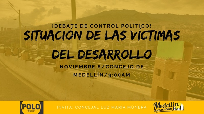 Por: Luz María Múnera, Concejal citante.Situación de la perosnas, víctimizadas por el llamado Desarrollo, a debate en el Concejo de Medellín. Martes 6 de noviembre, nueve de la mañana (9:00 a.m.), entrada libre.Cordial invitación:Situación de las Víctimas del Desarrollo a debate en el Concejo de Medellín. Martes 6 de noviembre, nueve de la mañana (9:00 a.m.)El Estado con la construcción de proyectos de infraestructura y de Ordenamiento Territorial, genera Víctimas.Víctimas del DesarrolloMedellín es un doloroso ejemplo: Parque Bicentenario, Tranvía de Ayacucho, Puente Madre Laura, Túnel de Occidente, Plan Parcial de Naranjal y Arrabal, Cable Picacho... Y la lista se hace interminable.Acompáñanos para exigir nuestro Derecho al Disfrute Pleno de la Ciudad.Recinto de sesiones Concejo de MedellínMartes 6 de noviembre 9 a.m.Informes: 3846843Invita Luz María Múnera Medina, Concejal de Medellín por el Polo Democrático Alternativo.NOTAS RELACIONADAS