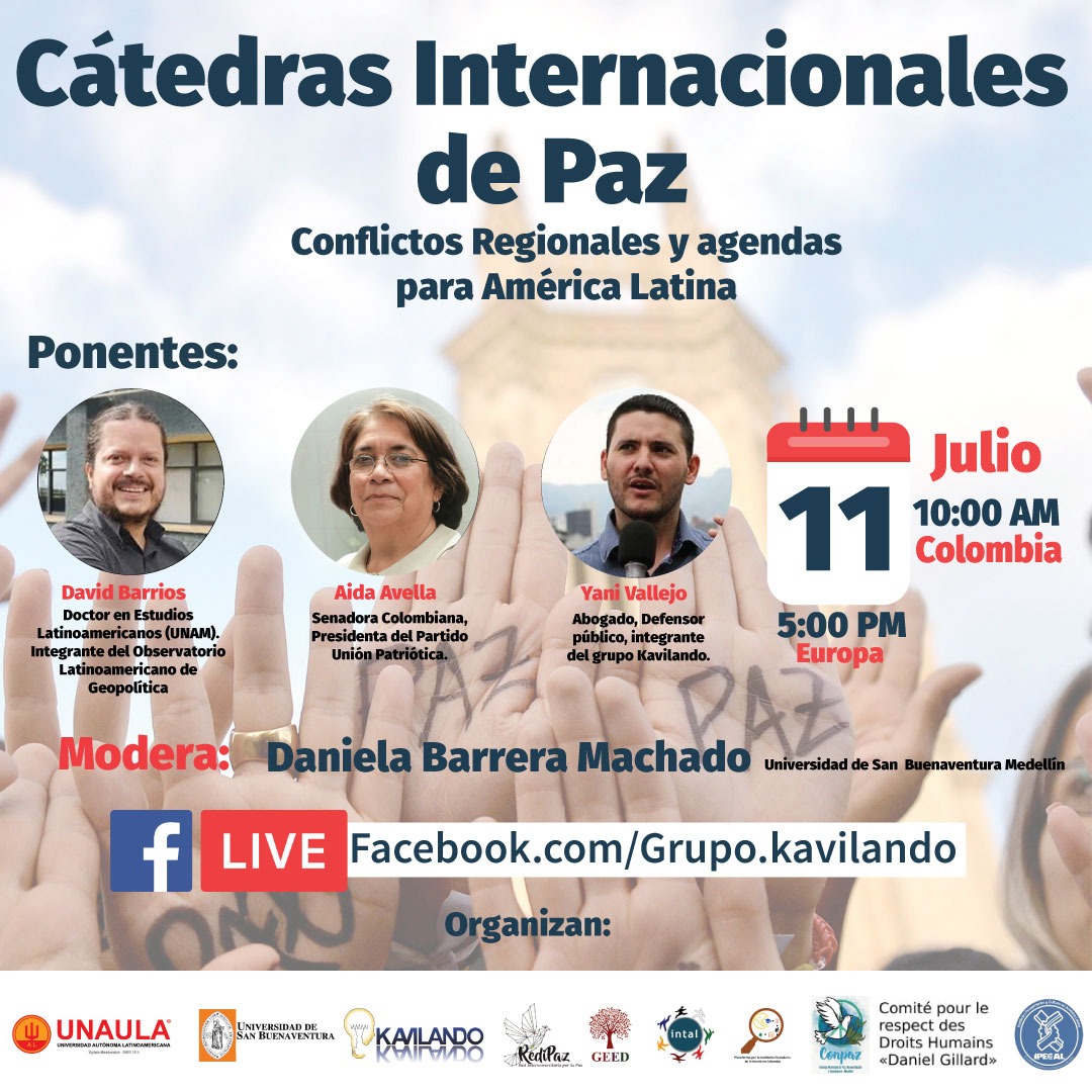 "Conflictos regionales y agendas para América Latina. Caso Colombia – Venezuela", será el tema con el que daremos inicio a nuesra Cátedra Internacional de Paz. invitados: David Barrios Mexico (Unam) Senadora Aida Avella y Yani Vallejo Duque, Abogado, defensor de derechos humanos integrante del grupo Kavilando. Fecha: sábado 11 de julio, 10 am hora Colombia/5pm Europa, en vivo por: https://www.facebook.com/grupo.kavilando