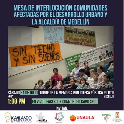 El próximo sábado 31 de julio a las 13HCol Auditorio Torre de la Memoria Biblioteca Pública Piloto, se realizará el encuentro entre comunidades Afectadas por el Desarrollo y la Administración Municipal de Medellín, con el fin de instaurar una "Mesa de Interlocución" para tramitar las múltiples problemáticas que aún no se abordan a pesar de exisitir una Política Pública de Protección a Moradores. En vivo por: https://web.facebook.com/grupo.kavilando