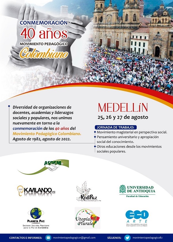Entre los días 25, 26 27 de agosto de 2022, algunas formas organizativas de docentes, academias y liderazgos sociales de variados lugares de Colombia nos reuniremos enlaciudad de Medellín, en torno a la conmemoración de los 40 años del movimiento pedagógicocolombiano, fenómeno organizativo memorable, acogido en gran parte de la geografíanacional, que emergió a partir del congreso pedagógico del 29 de agosto del año 1982, llevado a cabo en la ciudad de Bucaramanga.