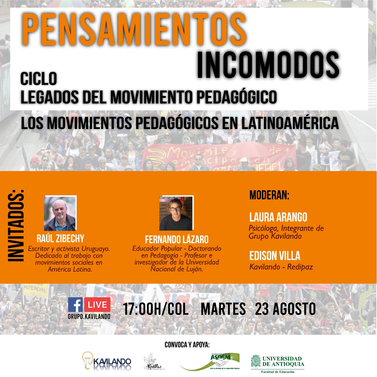 Martes 22 de agosto 17H Col. Invitados: Raúl Zibechi Escritor y activista uruguayo, Fernando Lázaro Educador Popular Investigador Universidad Nacional de Luján. Moderan: Laura Arango Psicóloga e investigadora Kavilando y Edison Villa Kavilando - Redipaz. en vivo por: https://www.facebook.com/grupo.kavilando